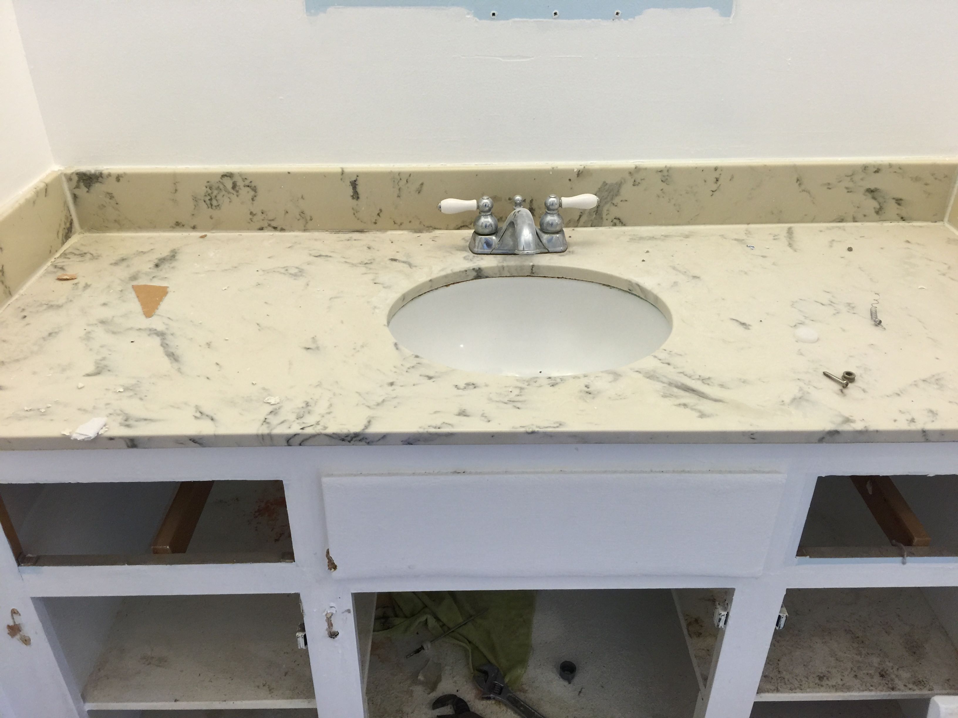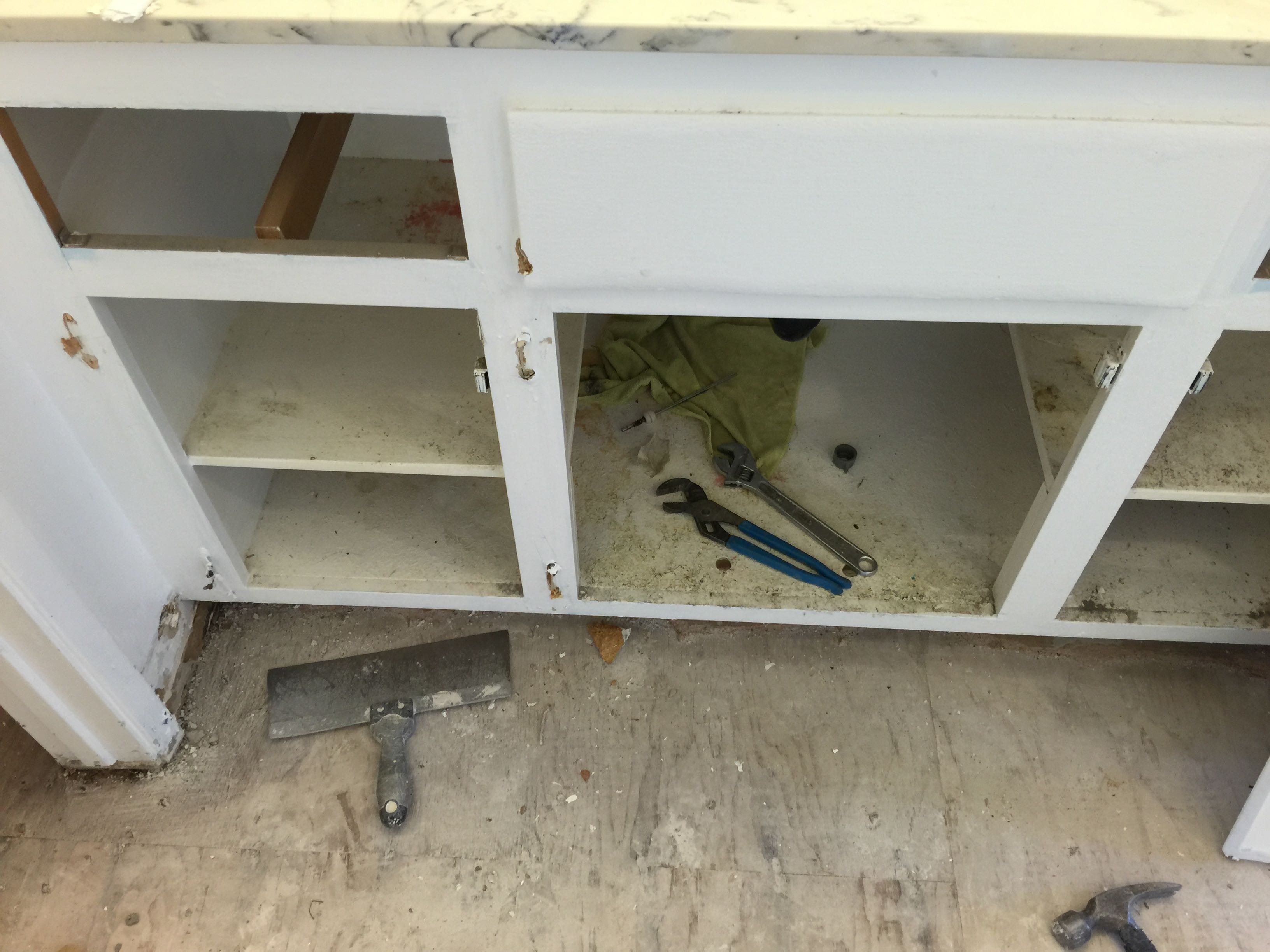Originally, we were thinking about reusing the vanity and top piece, but as you can see from the picture above, the cabinets are in pretty bad shape… I found a good local deal for $200, so figured it was worth the upgrade. I’m still searching for a vanity top.
