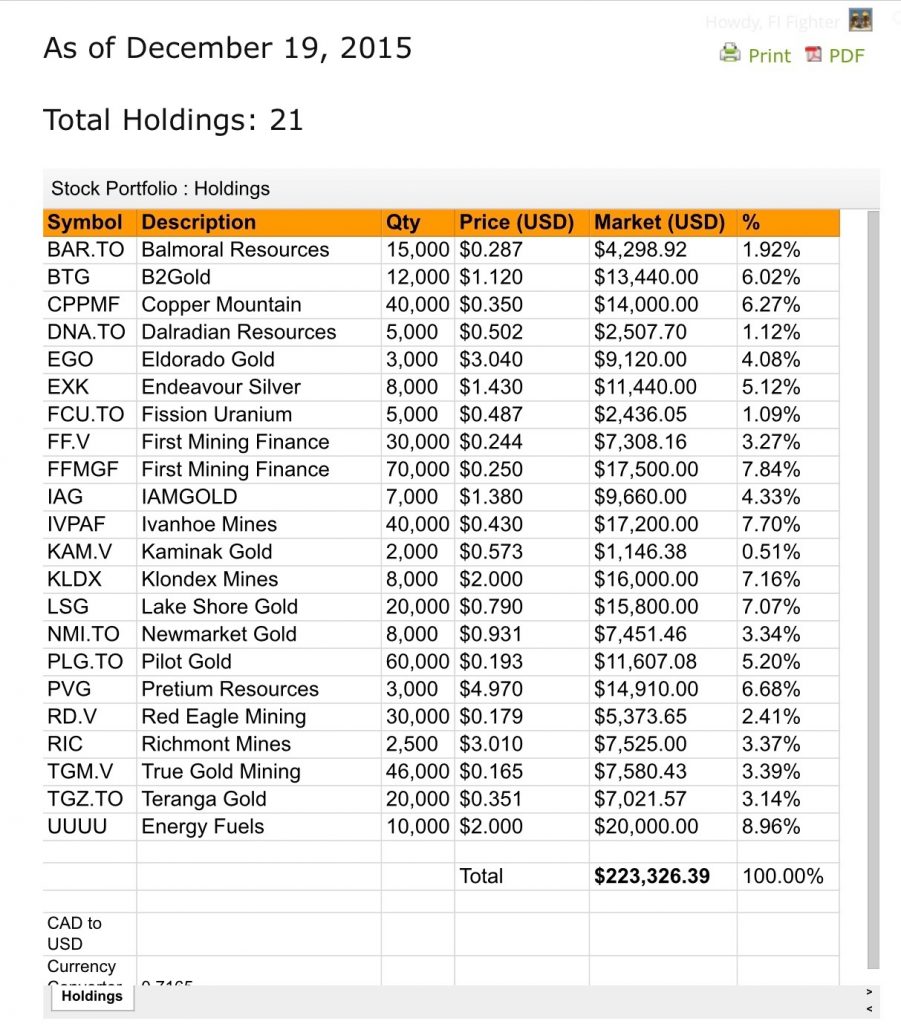 By the end of 2015, I had constructed a mining stocks portfolio that looked like the following.