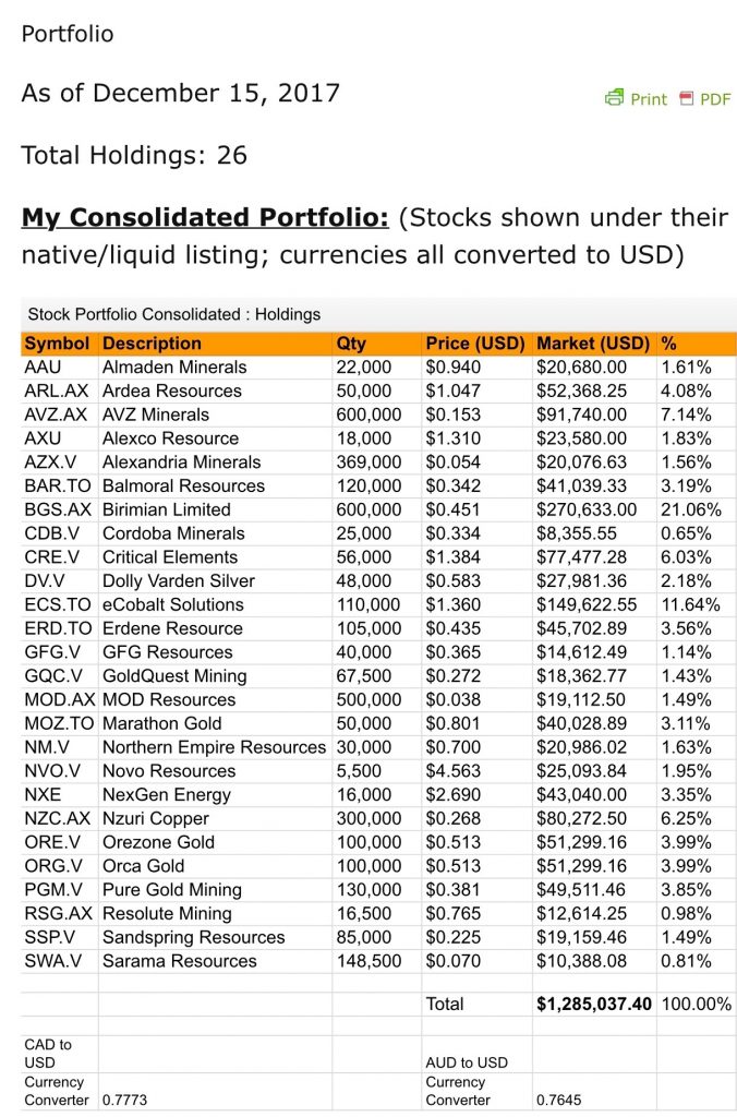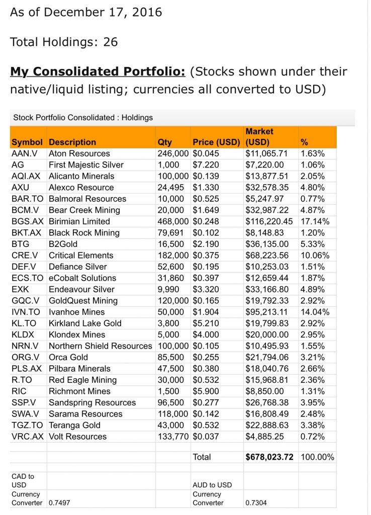 Fast forward towards the end of 2016, and after a rip-roaring rally in gold/silver equities, my mining stocks portfolio grew to this.