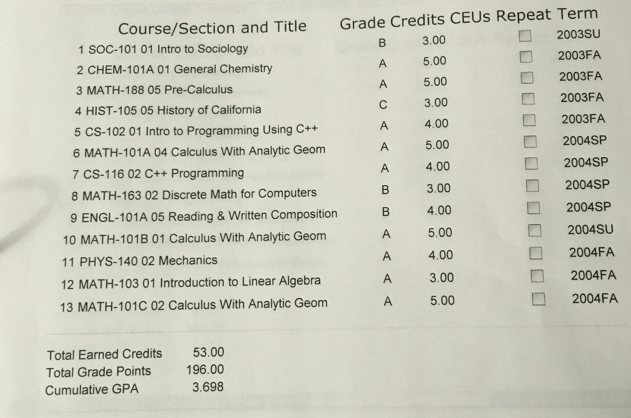 And to this day, I’ve probably not worked as hard as I did back in those early community college days… In a span of 2 years, I managed to force myself to finally understand math and worked my way up from: Pre-Calculus to Calculus I, to Calculus II, to Calculus III, to Differential Equations, to Linear Algebra, to Discrete Math, etc., etc…