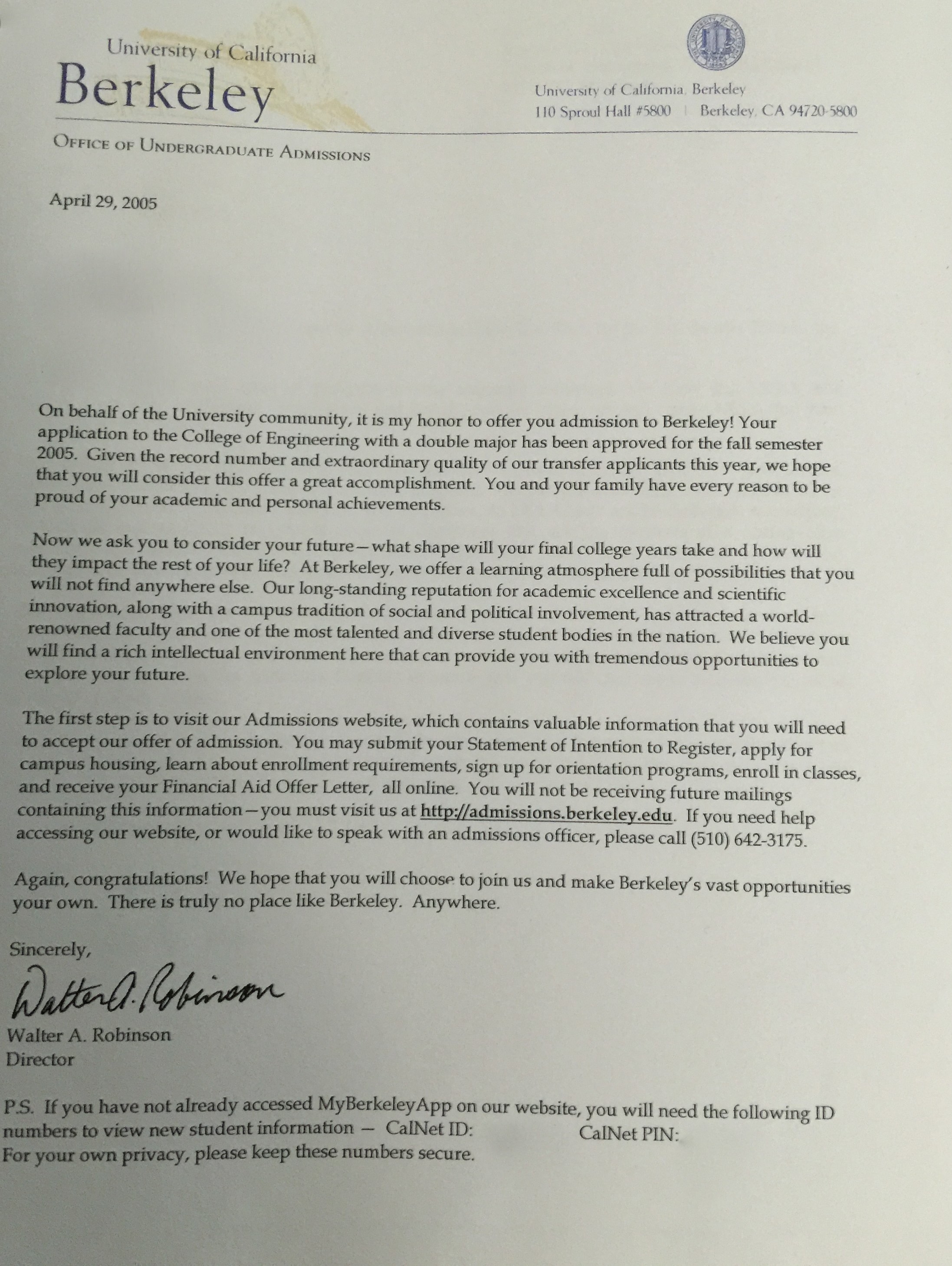 After 2 years, I finished with about a 3.7 GPA and was able to successfully transfer into my dream school: UC Berkeley (poor kids like me don’t grow up dreaming about attending prestigious schools like Stanford Stanfurd!). I was accepted into a dual-major engineering program.