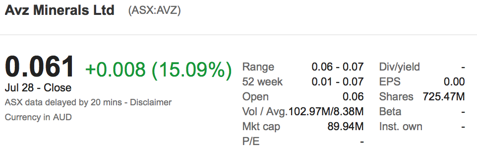 My newest position, AVZ Minerals (AVZ.AX) spiked up 15%, closing the session at A$0.061/share, but actually hit as high as A$0.067/share during intraday trading.