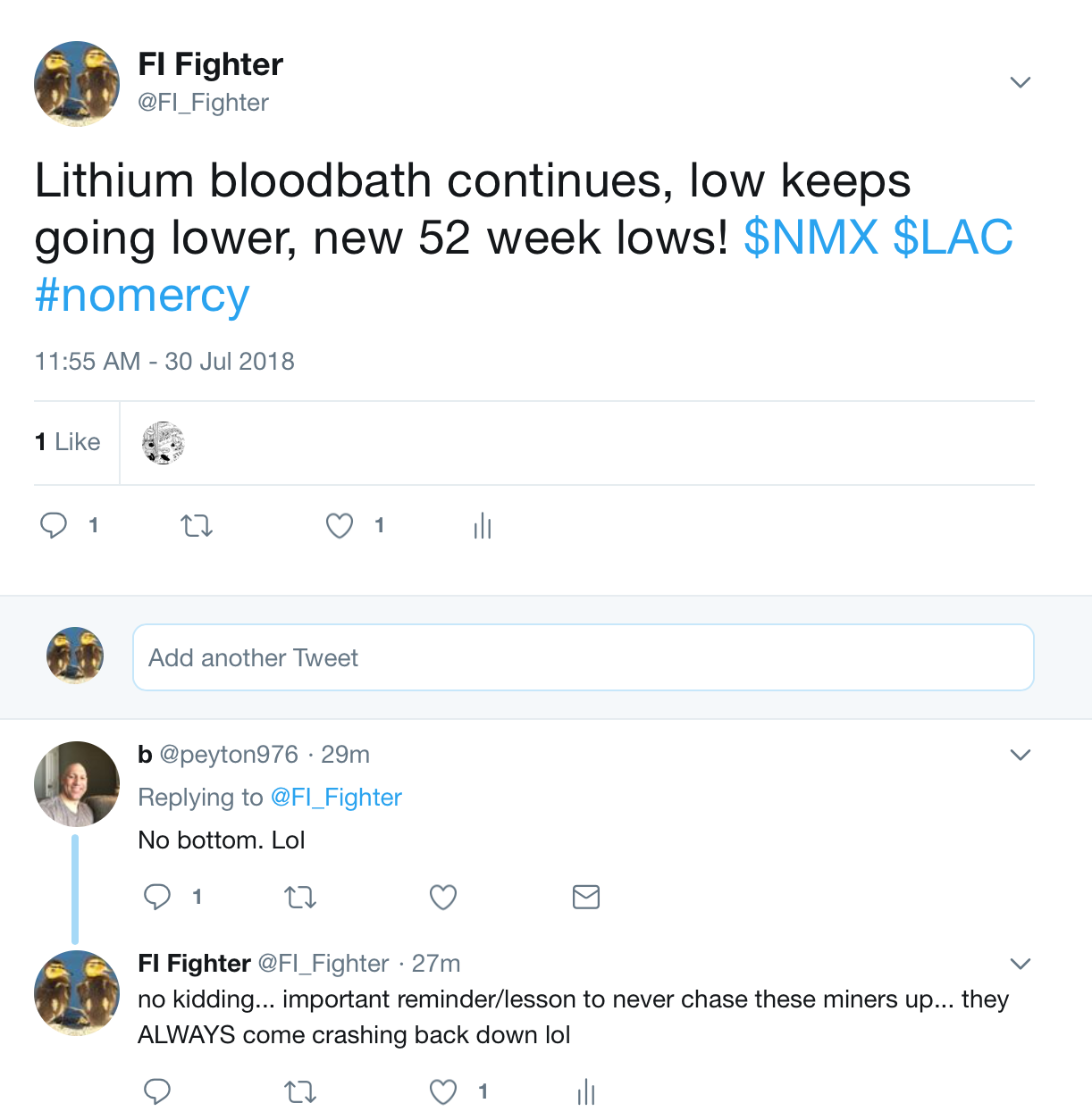 I was a seller of lithium stocks earlier this year in January when everything was a CAT 5 BRIMMER… In hindsight, I wish I sold everything then…