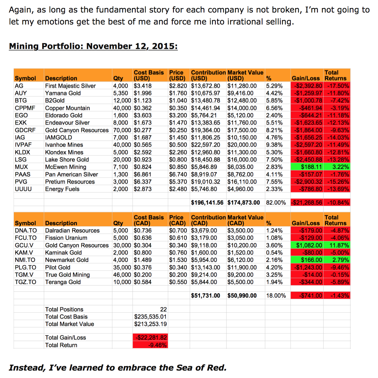 Great article, very real of you to post your losses, refreshing to read. Also I hear you on the fact that most people will say you are crazy to invest in junior mining stocks. “You will lose all your money”, “You can’t beat the market”, “give your money to a professional that knows that hes doing lol”