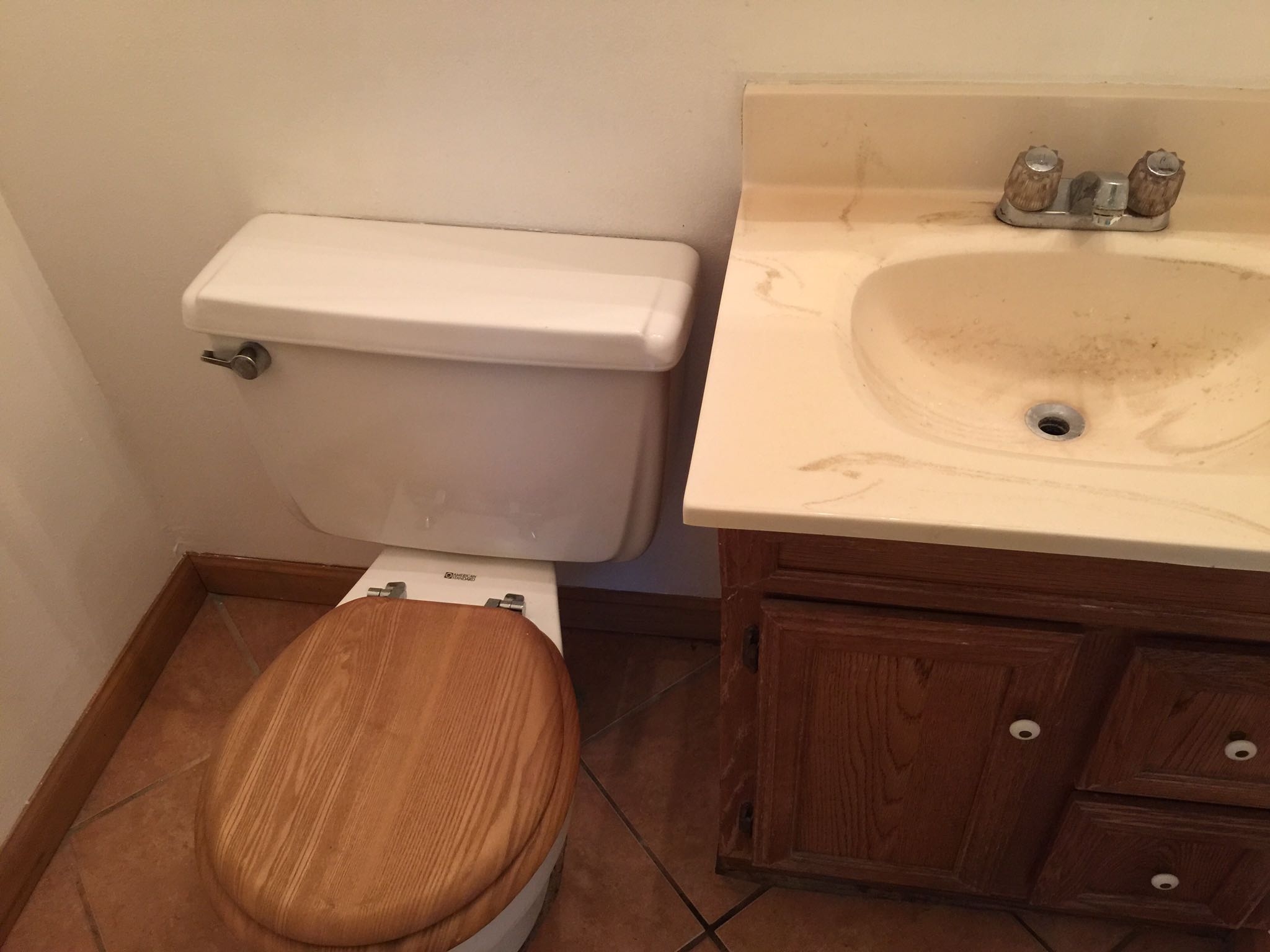 - Re-do half bathroom. Replace tile, toilet, vanity, ceiling fan.