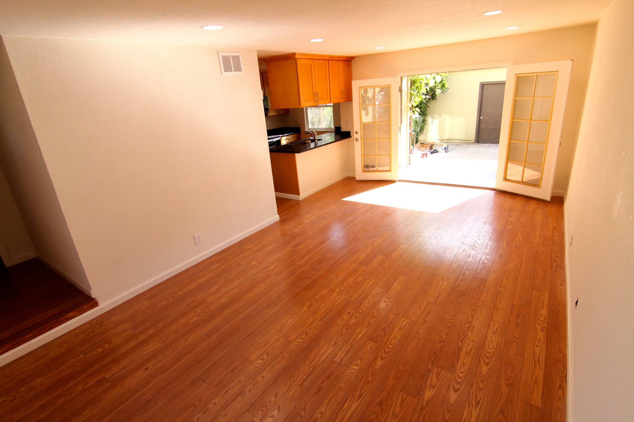 Most of the house was renovated, but we did not touch the 1st floor flooring since the original laminate downstairs was in good shape. We just had to remove a few scratched planks; luckily, the previous owner left behind spare parts that let us do so. Also, the kitchen was in good shape so we left that alone, for the most part. We just replaced the lights with recessed lighting and scraped off the popcorn overhead. The older appliances (stove, microwave, refrigerator, washer and dryer) are in good condition and can be re-used.